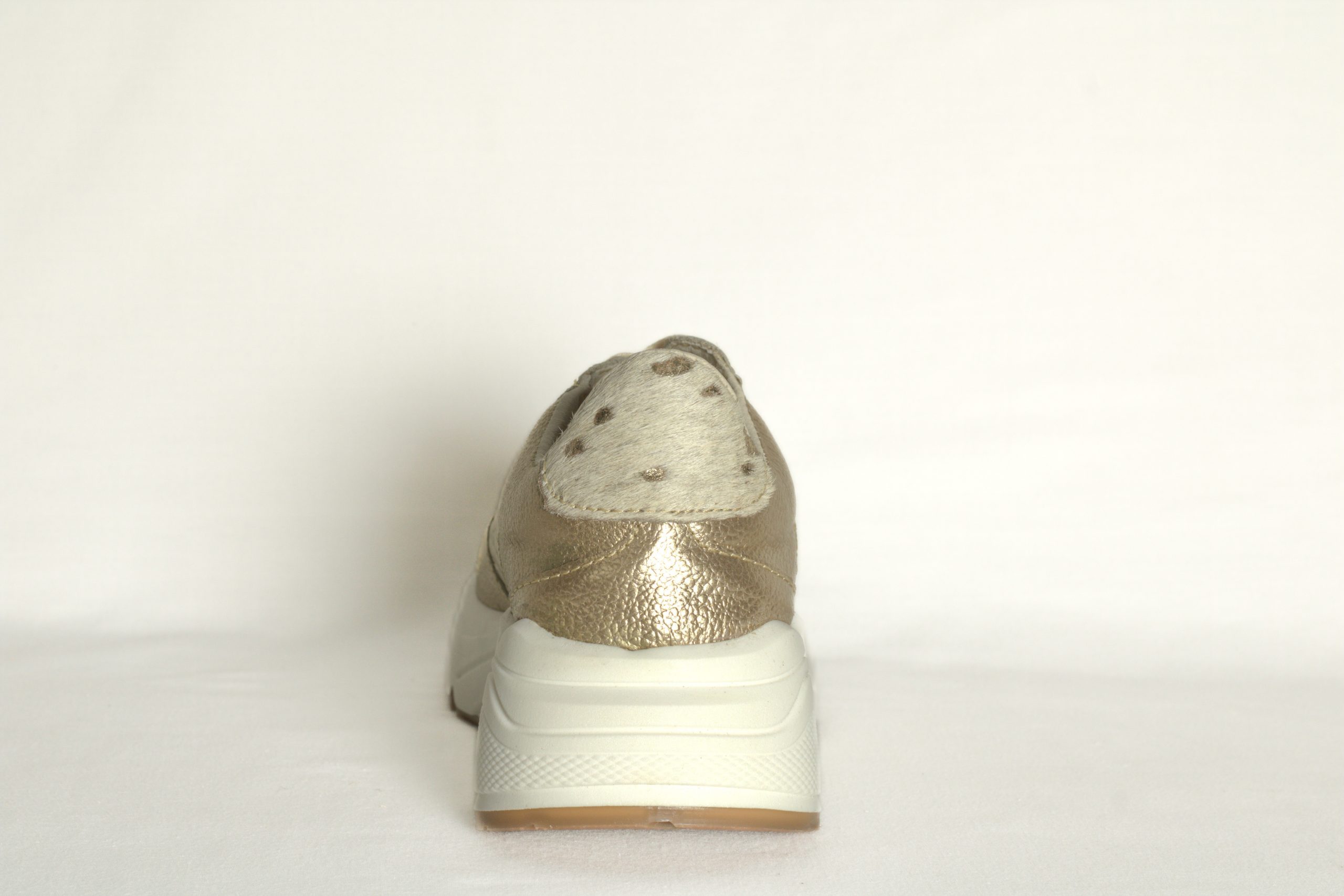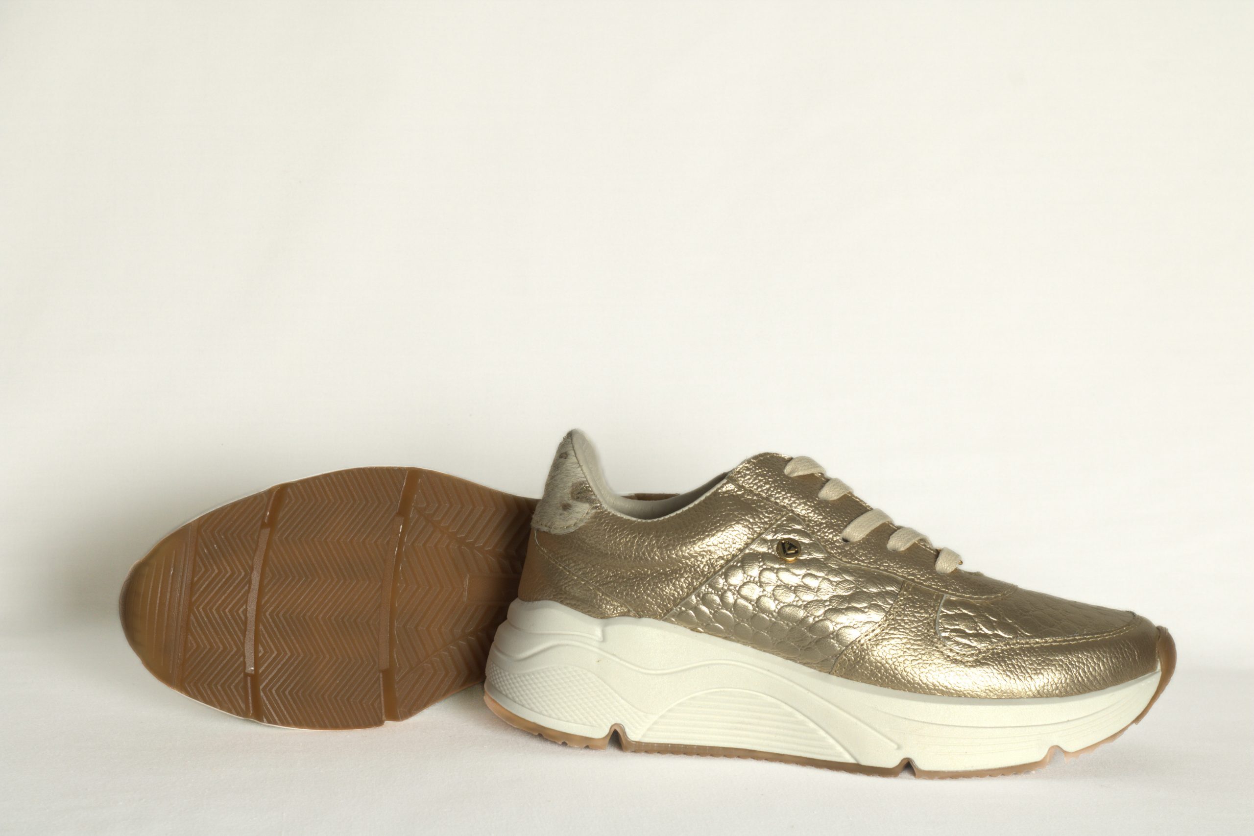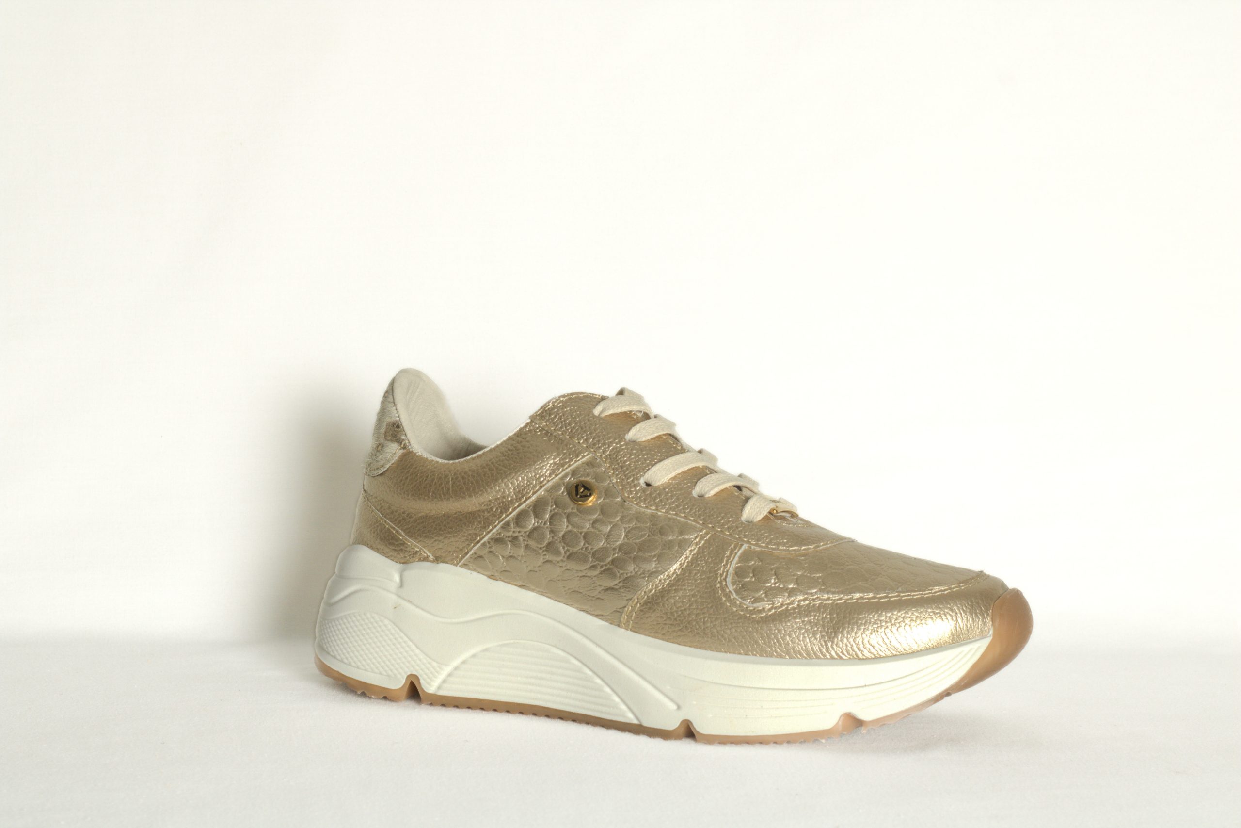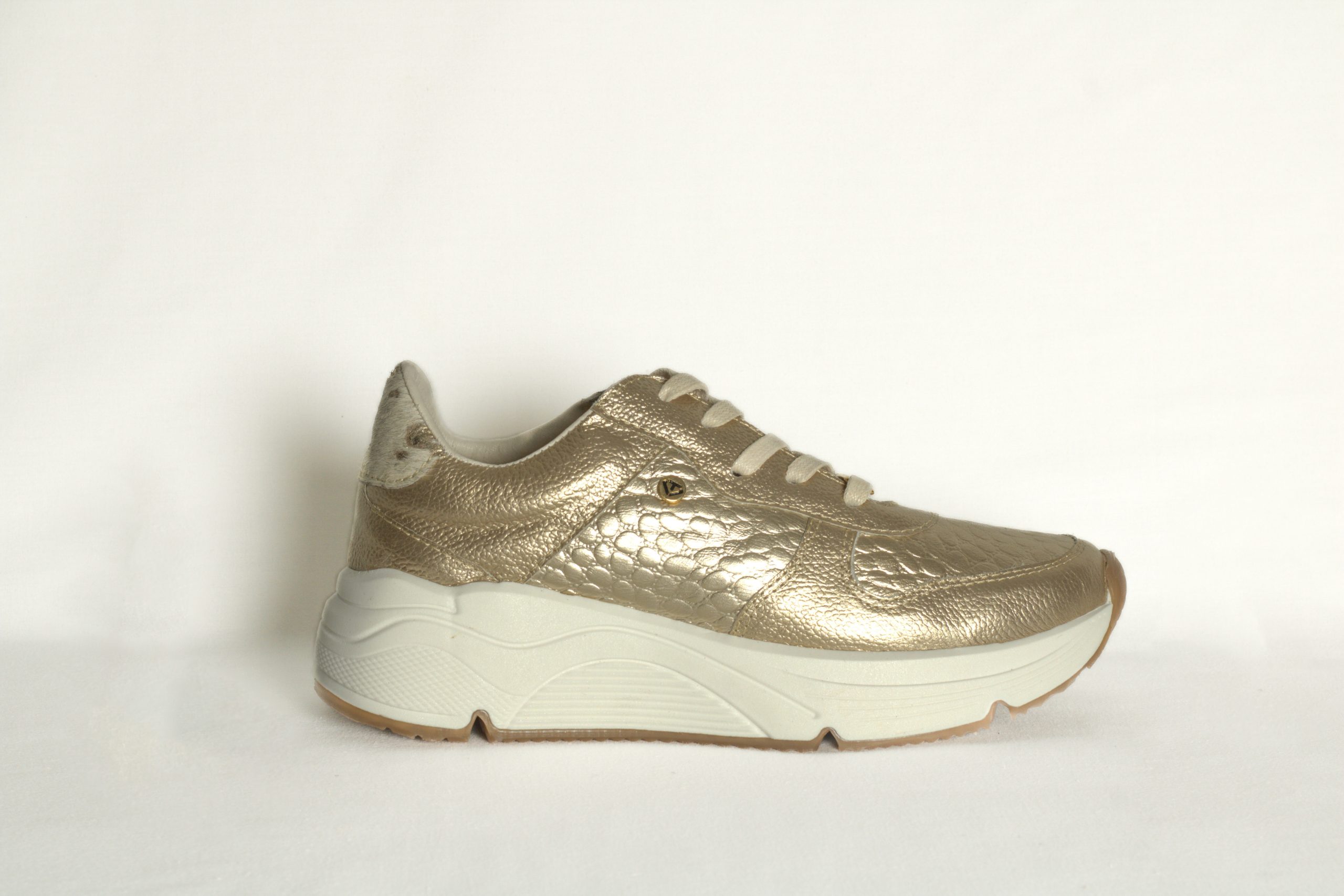 Tenis en cuero color oro, comodidad total y un brillo que marca tendencia.