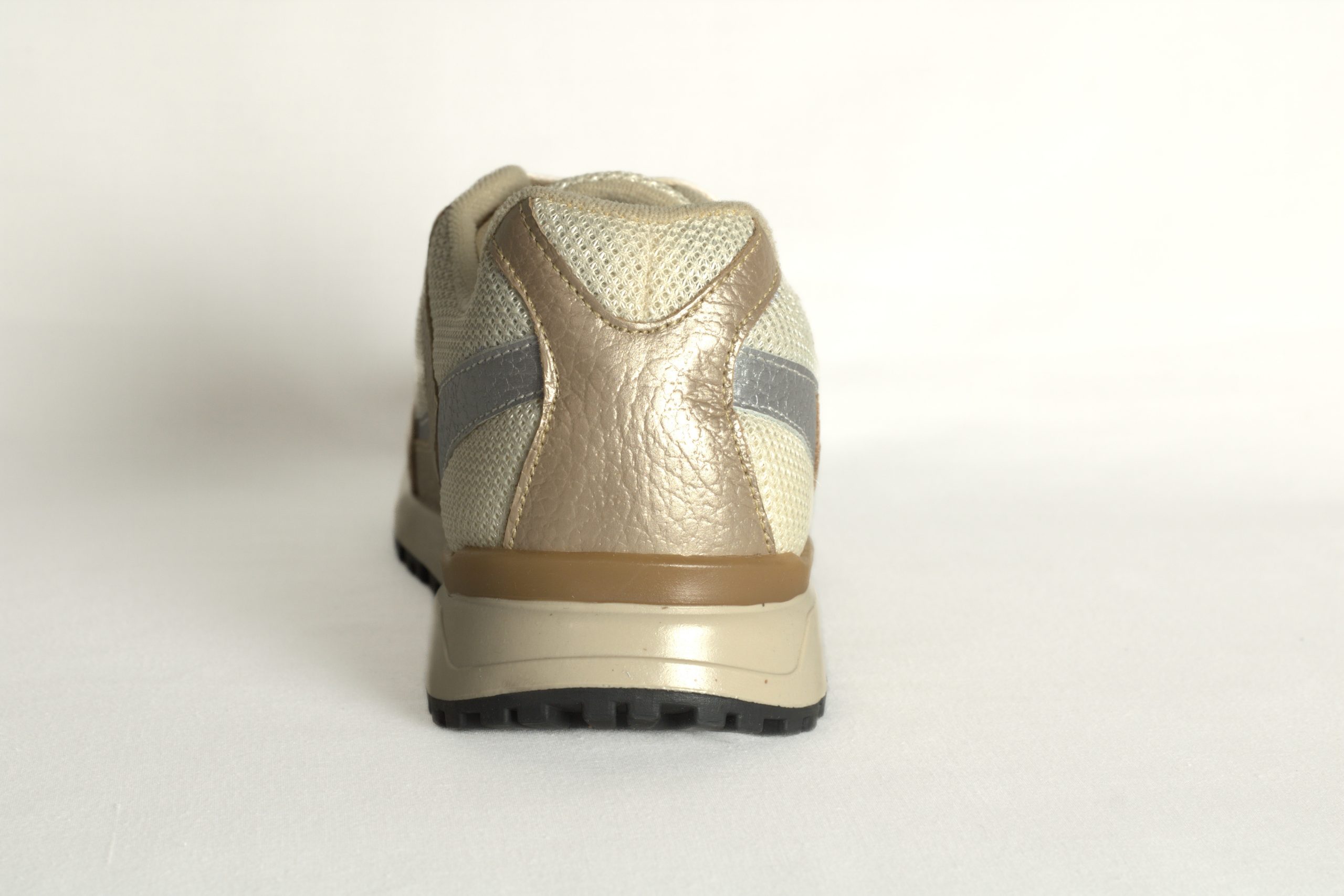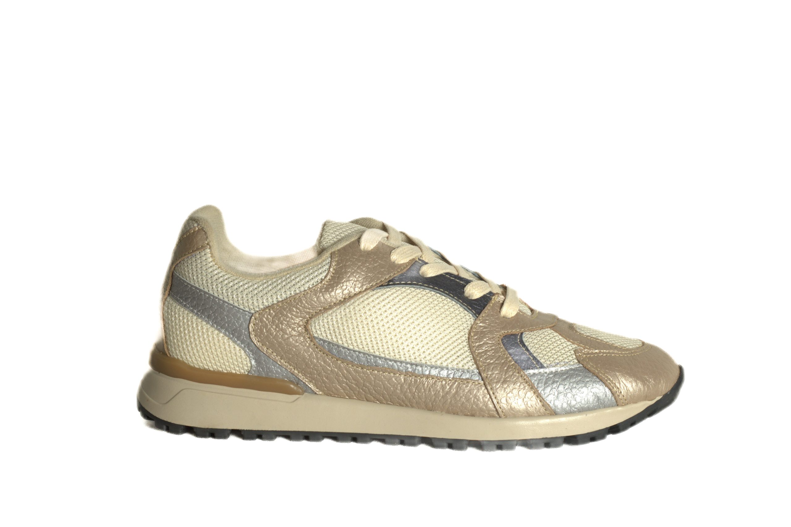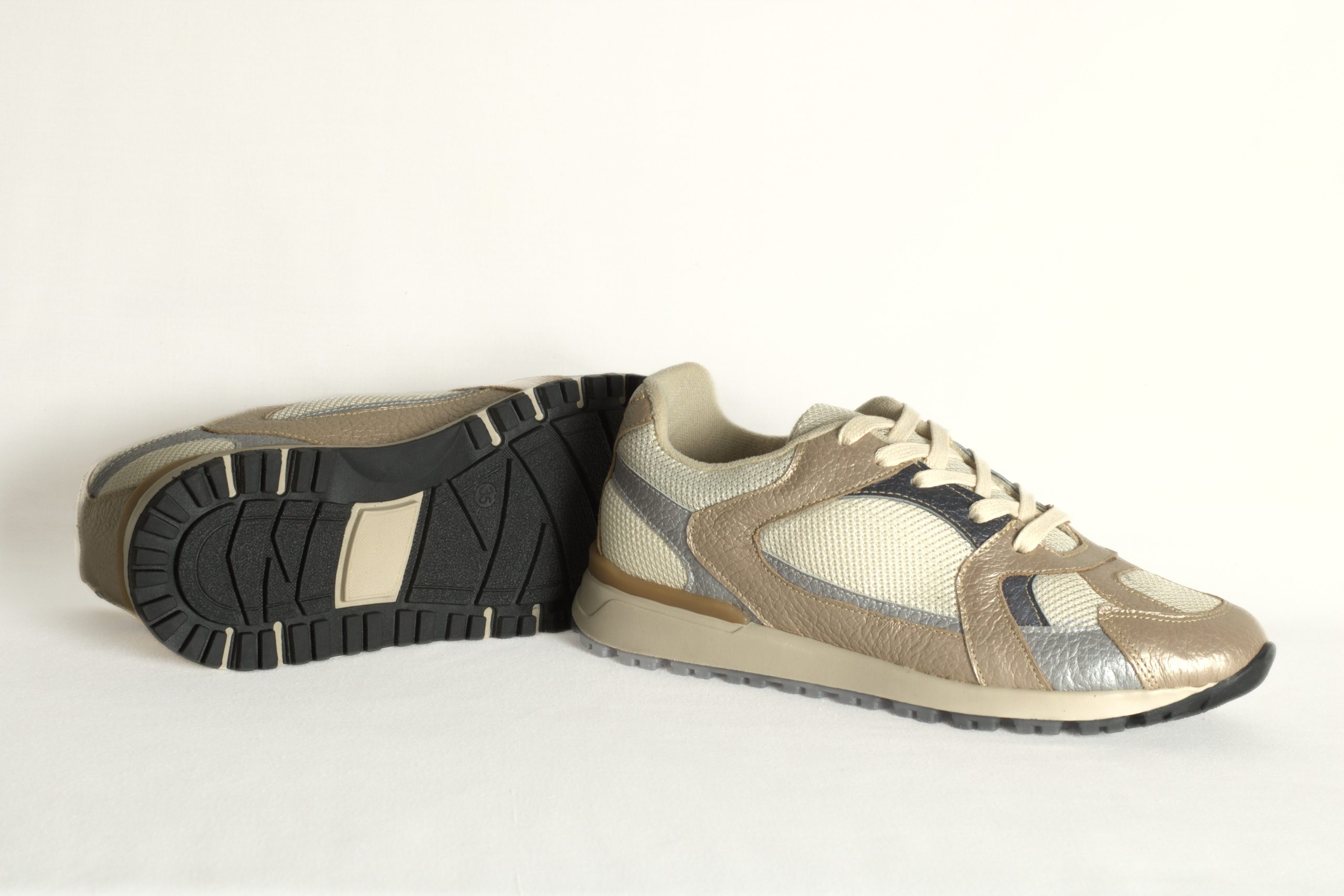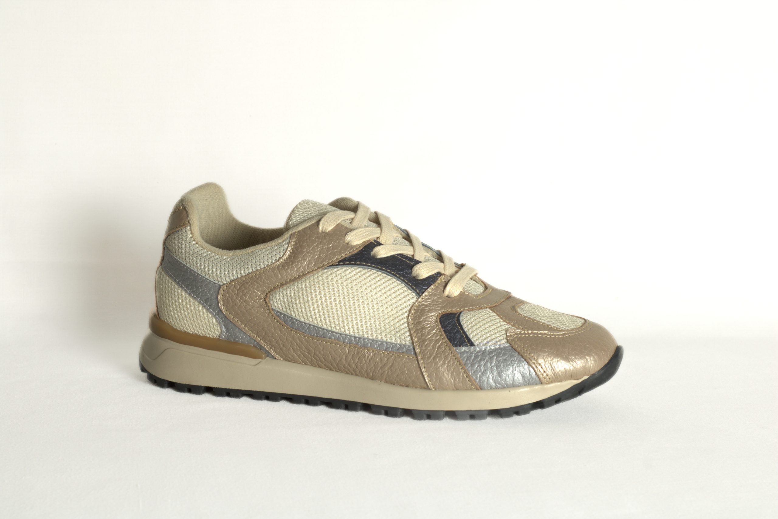 Tenis en cuero y textil beige con toques champan, azul y alumnio. Diseño ligero y cómodo para todos los días.