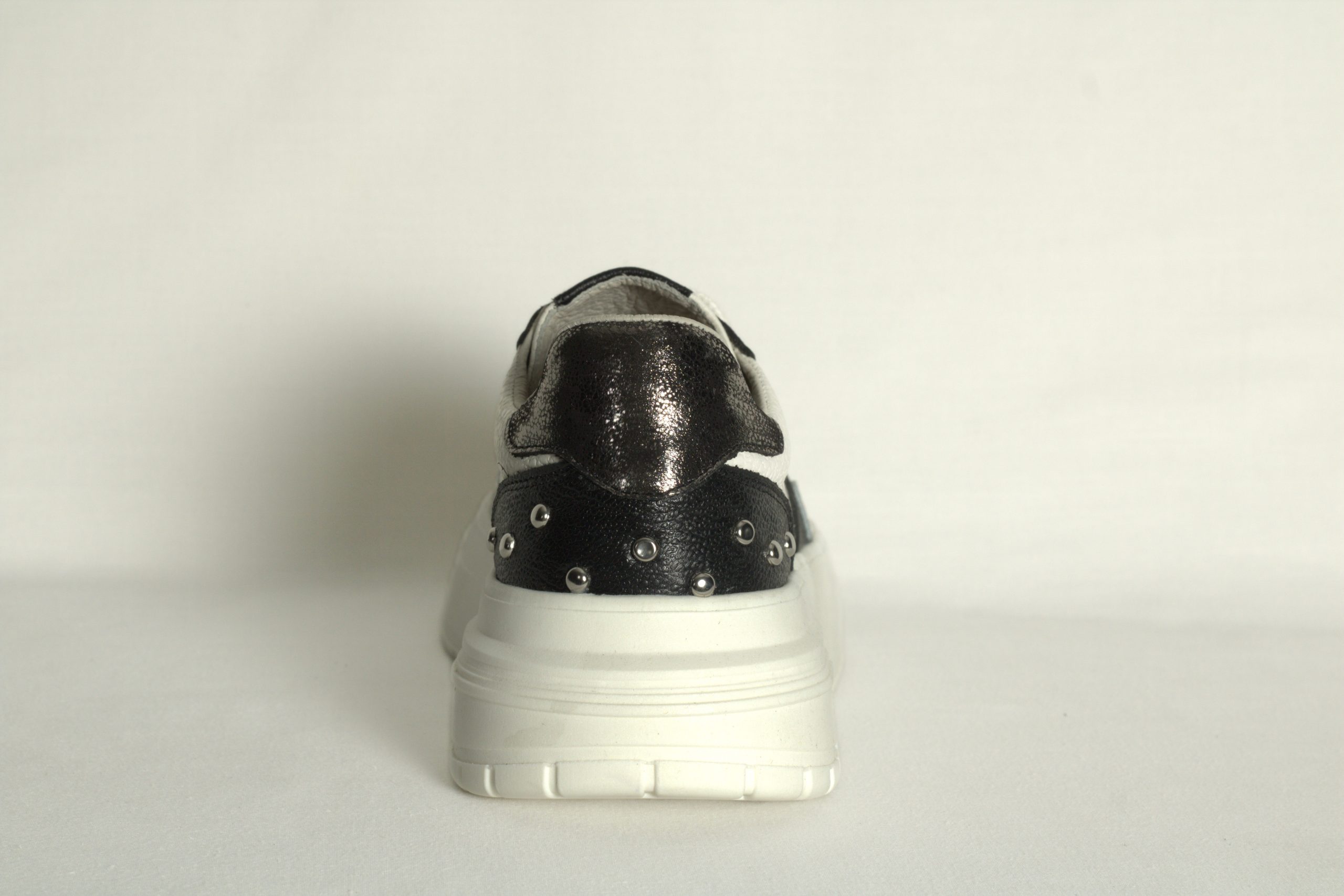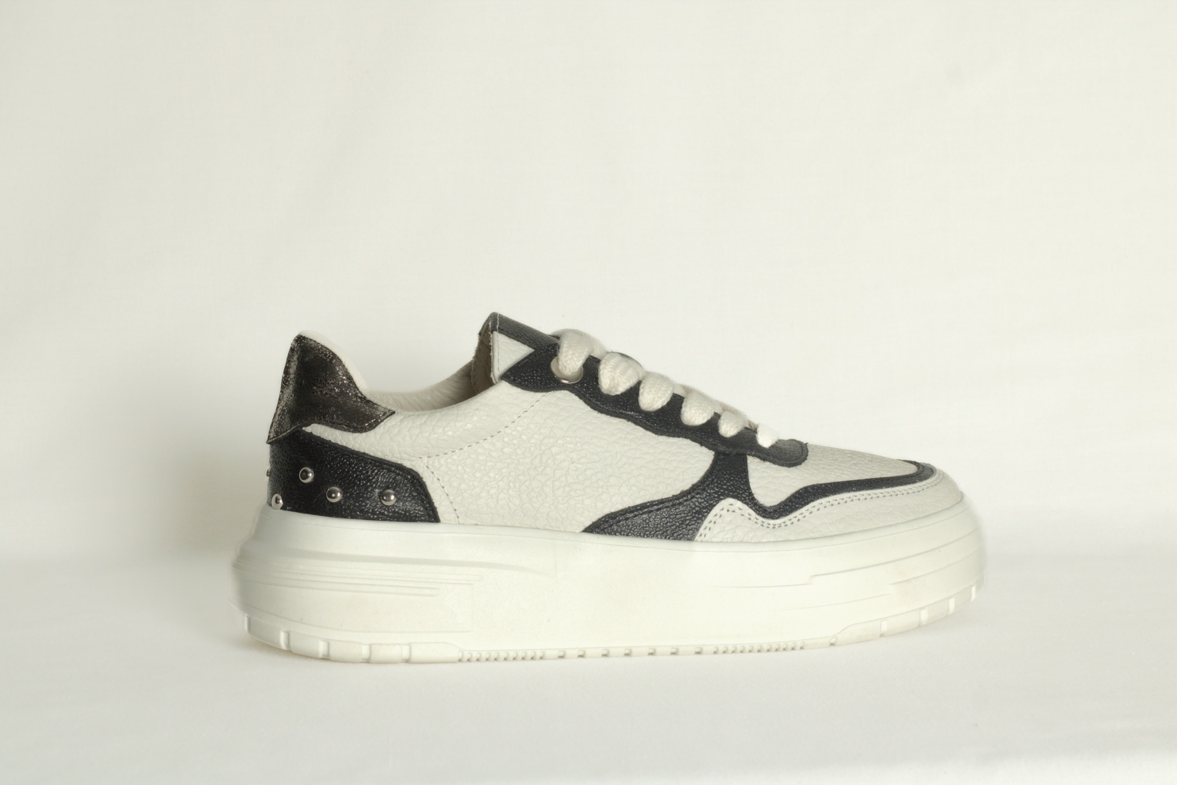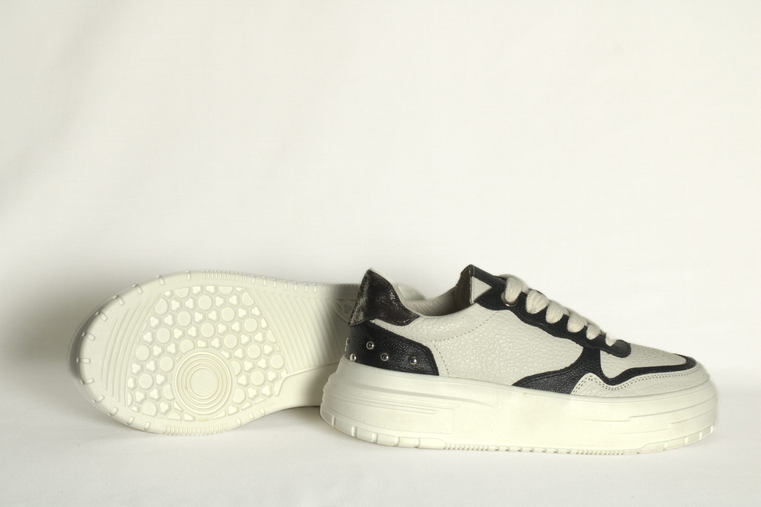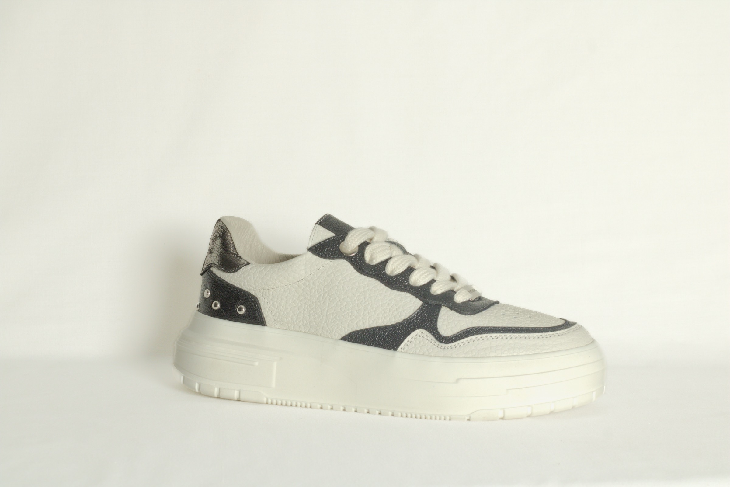 Tenis de cuero blanco hueso  y negro, suela ligera y detalles metálicos.